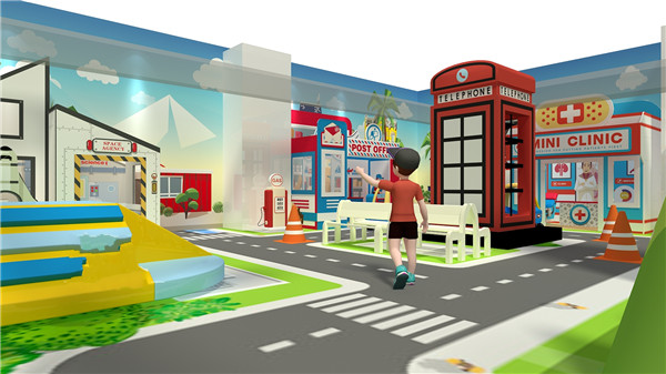 Papan dolanan kalebu macem-macem area tema, kalebu pawon bocah, kantor pos, restoran, supermarket, rumah sakit, lembaga antariksa, rumah sakit, pompa bensin, dolanan lemah, dalan, dalan, lan liya-liyane. Saben wilayah wis dirancang kanthi ati-ati kanggo nyedhiyakake pengalaman immersive kanggo bocah-bocah, supaya bisa njelajah lan melu lingkungan ing saubengé.