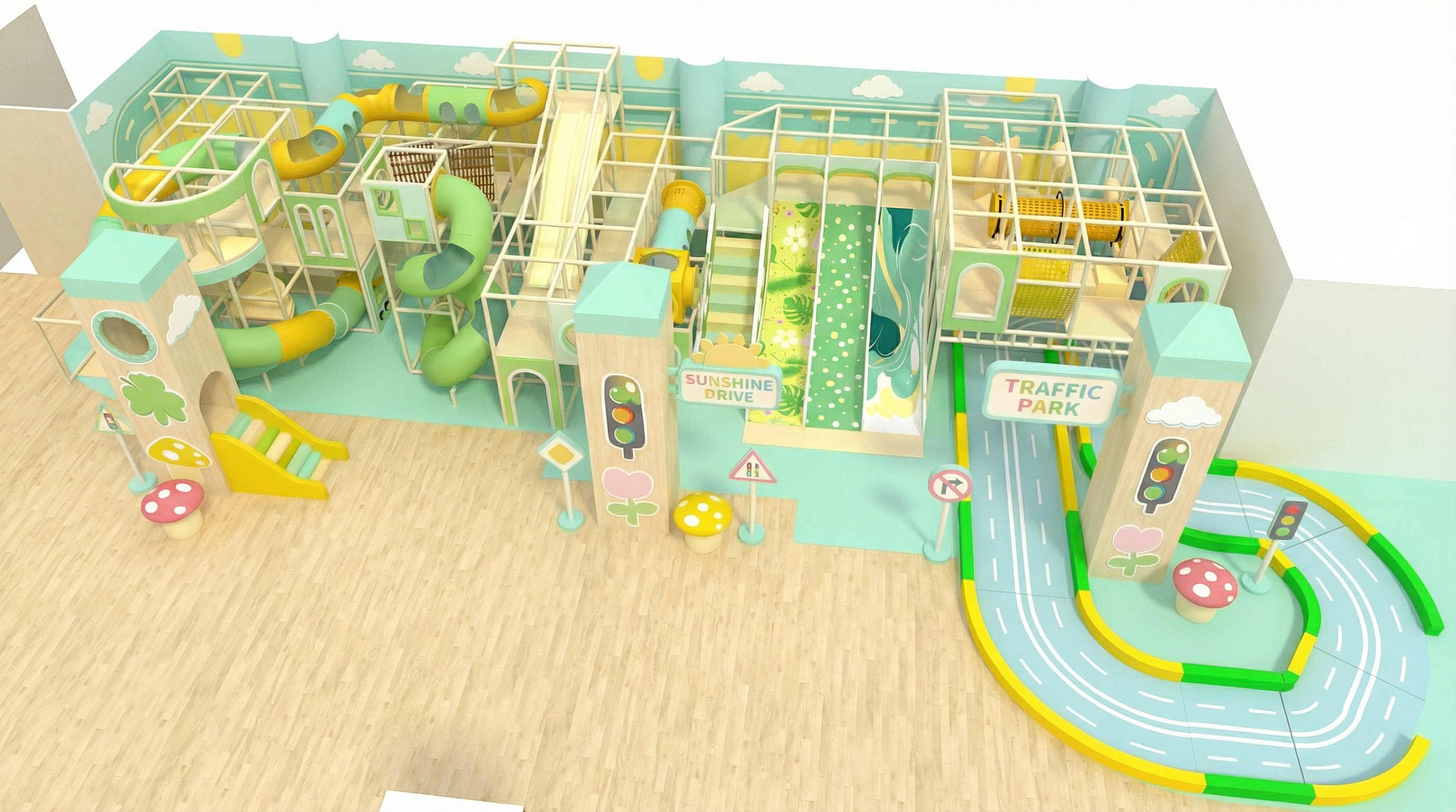 In a market saturated with over-stimulating neon colors, OPLAY creates a sanctuary. The "Sunshine Traffic Park" combines two powerful trends: Biophilic Design (bringing nature indoors) and Traffic Education. The palette of Mint Green, Lemon Yellow, and Light Oak Wood is scientifically selected to lower anxiety in toddlers while maintaining a cheerful, sunny atmosphere.